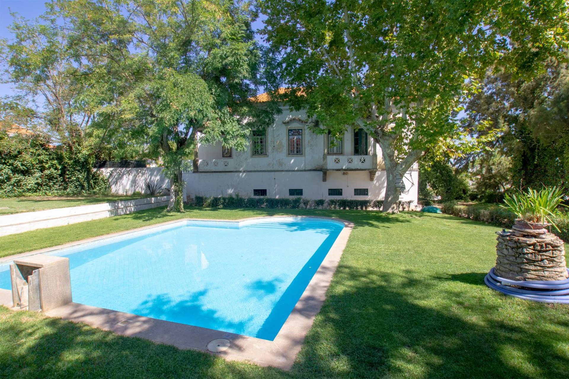 Oásis privado: Um jardim exuberante com piscina privativa, churrasqueira e recantos sombreados para relaxar.